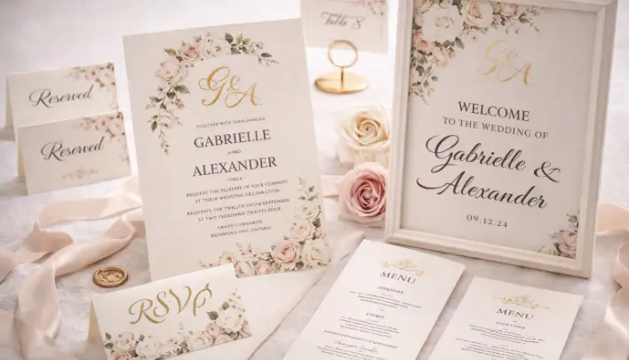 Beautifully designed invitations, signage, menus, and printed details that tie your wedding aesthetic together.